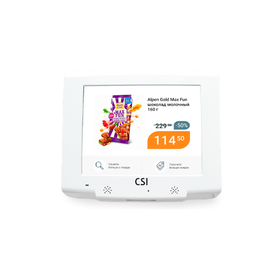 Большой дисплей 10,1 дюйма вмещает максимум информации о товаре и действующих акциях. Благодаря встроенному динамику позволит озвучить цену и другие характеристики товара. Выведет проморолик.